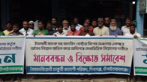 শিবগঞ্জে ইসলামী ব্যাংকে বিশেষ অঞ্চলের সকল অবৈধ নিয়োগ বাতিলের দাবিতে মানববন্ধন